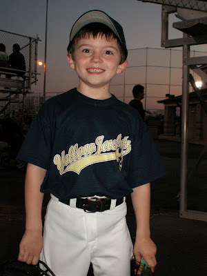 Bay gave a good effort, but got on base because he got hit in the head by the pitcher. Yes, can we all say "Thank God for batting helmets"! He took the hit and stayed standing, pretty tough young man if I say so myself. I gotta give myself credit too, I didn't jump over or through the fence to save my baby. There is nothing like the sound of your child getting beamed in the helmet by a baseball.